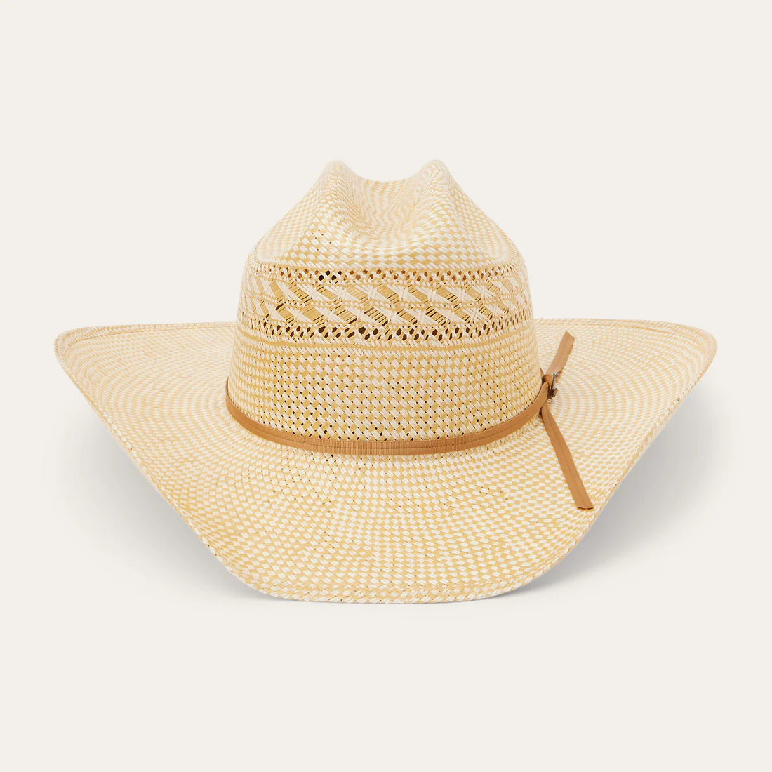 Handmade in the U.S.A. from high-quality shantung, the Classic 10X Straw Cowboy Hat has a 4 1/4” brim and a 4 1/8” vented cattleman crown for superior circulation and breathability. The crown is finished with a simple grosgrain hat band and branding iron hat pin bearing the initials “JBS”, a nod to our founder, John B. Stetson, whose pioneering legacy lives on in every hat we sell. A genuine leather sweatband ensures a secure fit and all-day comfort.