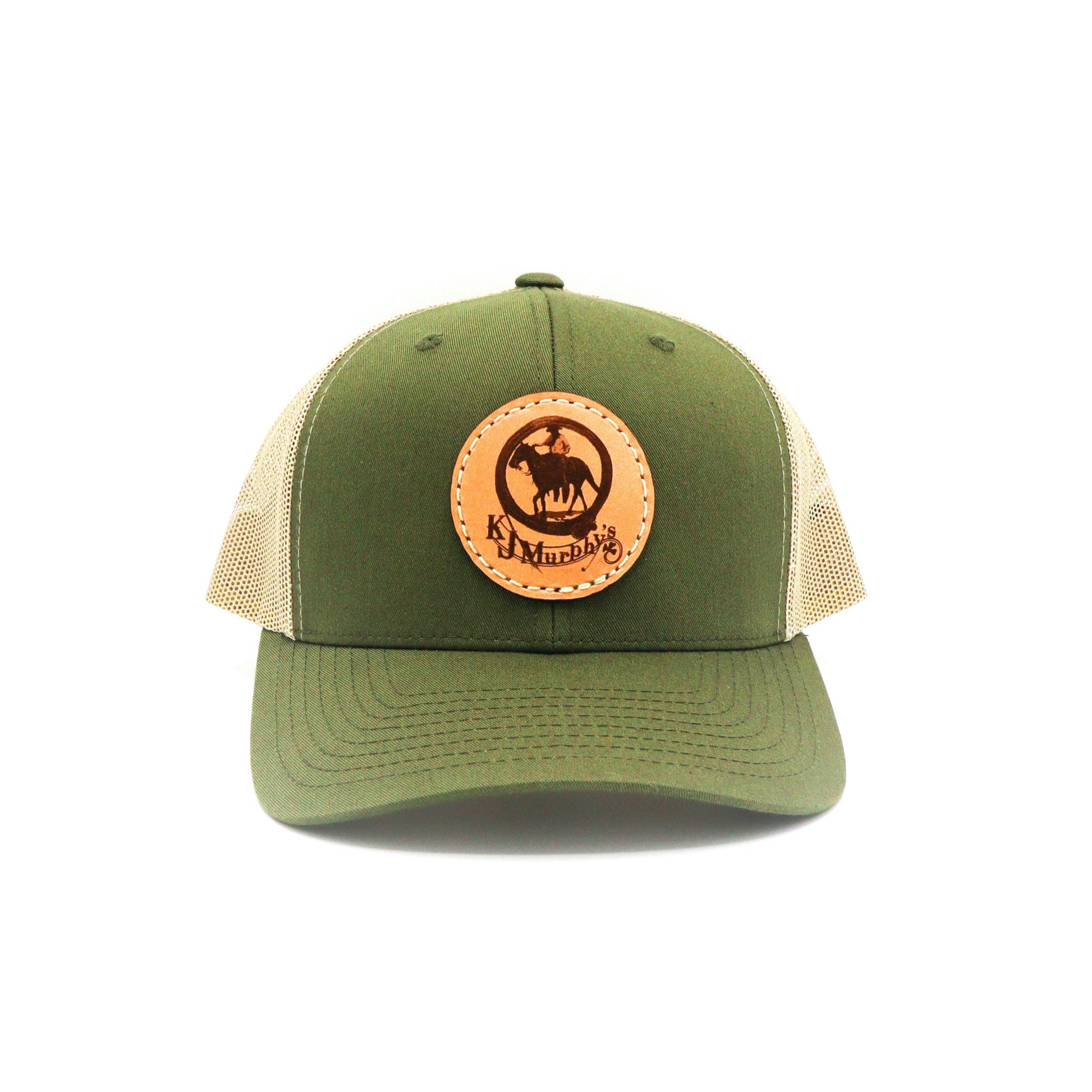 KJ Murphy's Trucker Hat in olive green with branded leather patch on crown.
