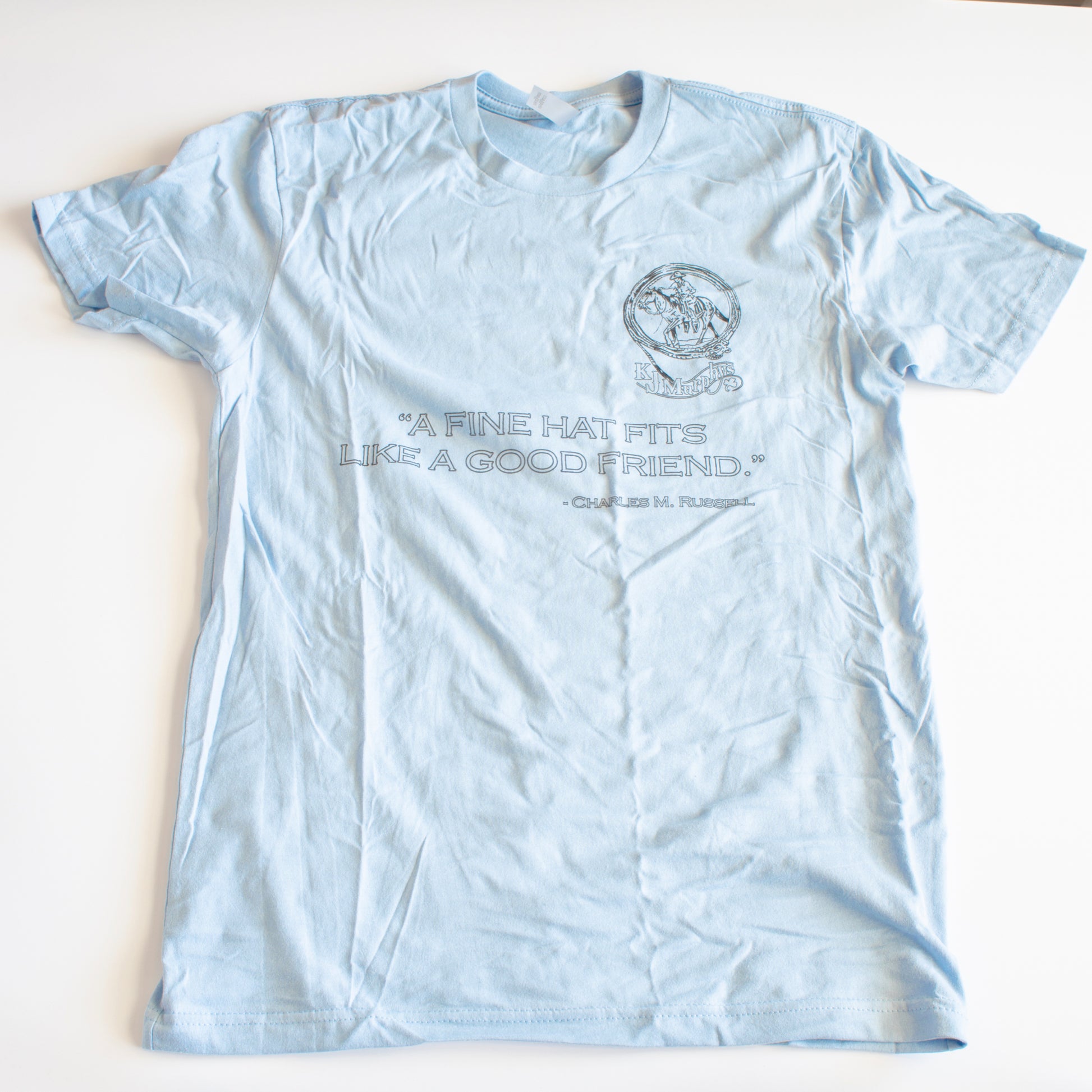Soft ringspun cotton tee with Charles M. Russell quote on the front and large KJ Murphy logo on the back. Fits true to size.