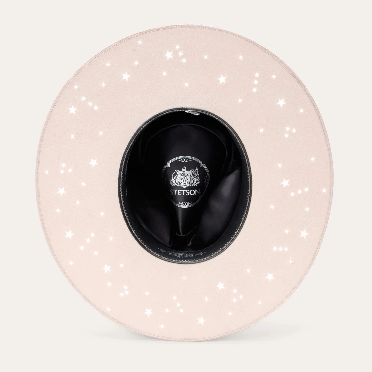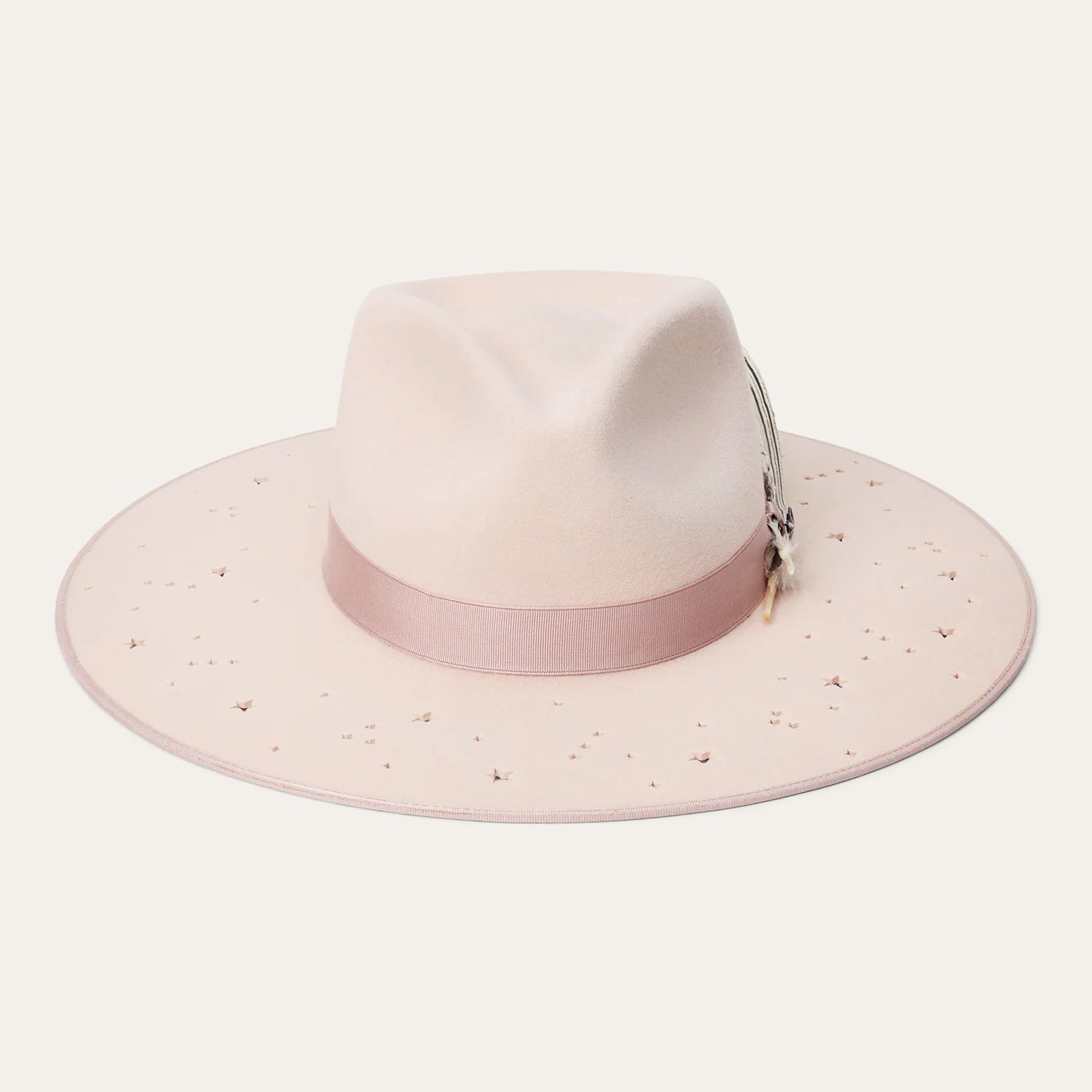 This unique hat features distinctive star cutouts on its wide, flat brim, along with both a feather and a custom Stetson Star Pin on the grosgrain hat band. This hat is crafted with firm felt, and a high-quality leather sweatband at the interior.
