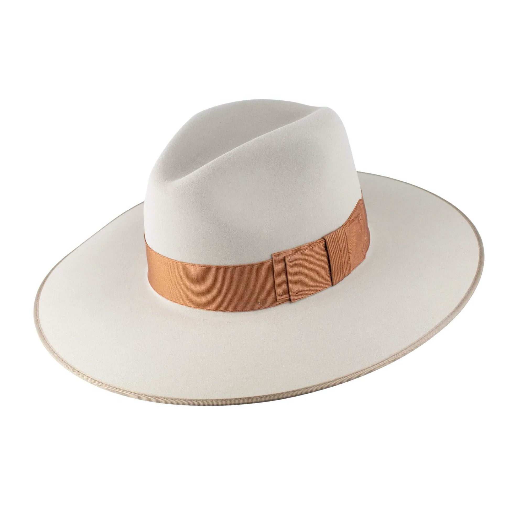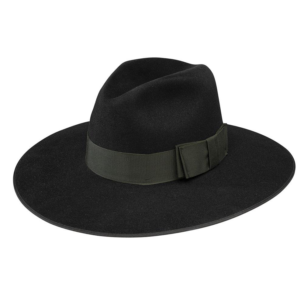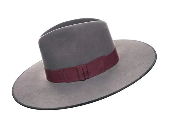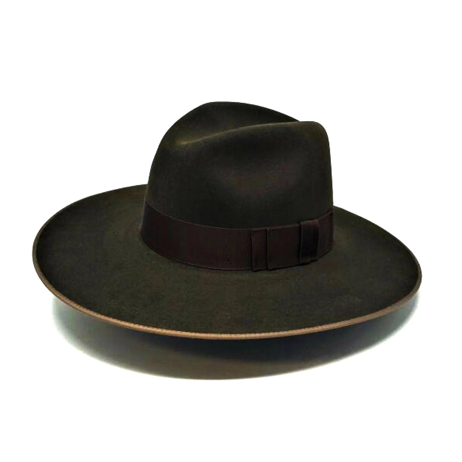The Stetson Tri-City Wide Brim Fur Felt Fedora is a handsome modern style fedora made from a firm fur felt. Featuring a classic centerdent crown but modernizing the look with a wide 3 3/4" bound-edge brim. The hat is balanced out with a wide hat band. Fully lined and finished inside with a leather sweatband.
